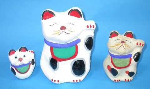 下総の諸玩具は実にいろいろな種類が存在する。招き猫も何種類あるかわかか不明である。よく見かけるのはこの型で、画像のものは張り子で毛色は三毛、素地は和紙に近い色を下地に塗っている。招き猫はこの下地の色の他に白と黒が基本となっている。また模様は三毛、黒ブチと黒猫が基本となる。目は細め、丸目などがあり、下地・模様・目の組み合わせによりいろいろなバターンができあがる。また前垂れにいろいろな柄が入ったタイプも存在する。どれも顔は少し上を向いている。