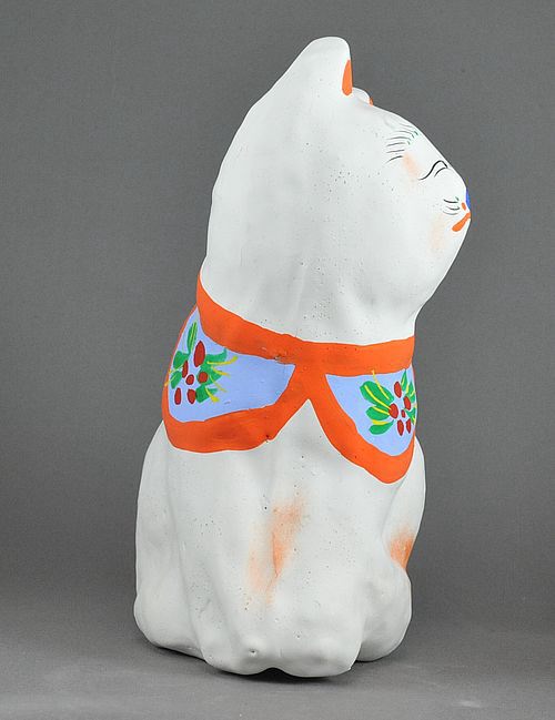 高さ205mm×横120mm×奥行105mm 模様なしの白猫 右手上げの常滑タイプの形状 大きな目にサーモンピンクの鼻 ひげは立派だが眉毛はない 千萬両の小判抱き 赤の首玉に金の鈴、青緑系の前垂れで松竹梅の柄が入る 手足の先には金と赤の彩色がある 金の部分は肉球か? 眉毛がないので猫の額が広い その後、猫の色のバリエーションも増えている |