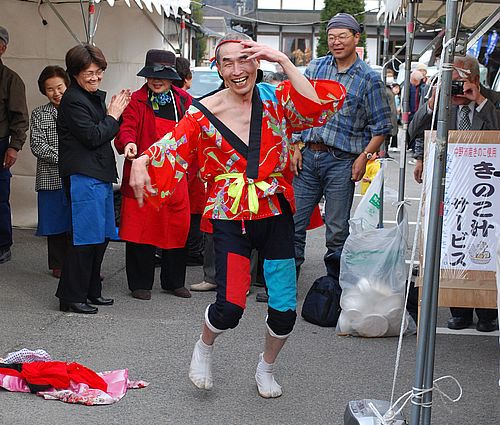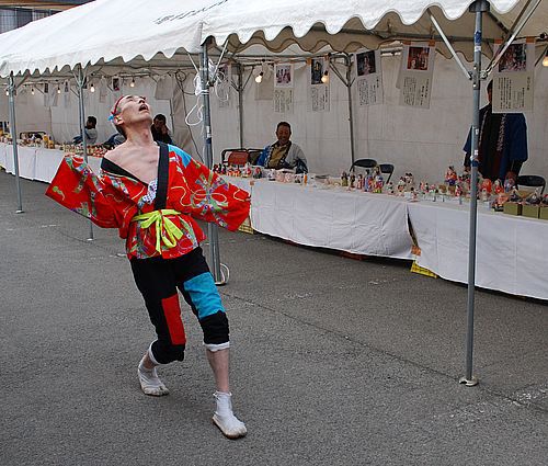 その後、「蚕鈴」さんのインスタグラムに この猫の型が掲載された 使わせていただくことにした 三春張り子の猫の型 「kaikosuzua」より 橋本広司さんはひょっとこ踊りの名人でもあった 下は2009年の中野ひな市の陣屋県庁記念館で 展示販売をしたとき 全国郷土玩具販売テントに現れた橋本広司さん |