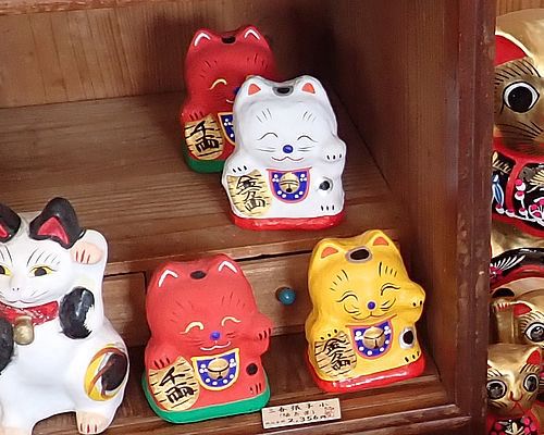本家大黒屋(大黒屋物産館)にはネズミにだまされて干支に入れなかった「うっかりネコ」シリーズもある。彦治民芸にも座り猫や達磨風の招き猫がある。