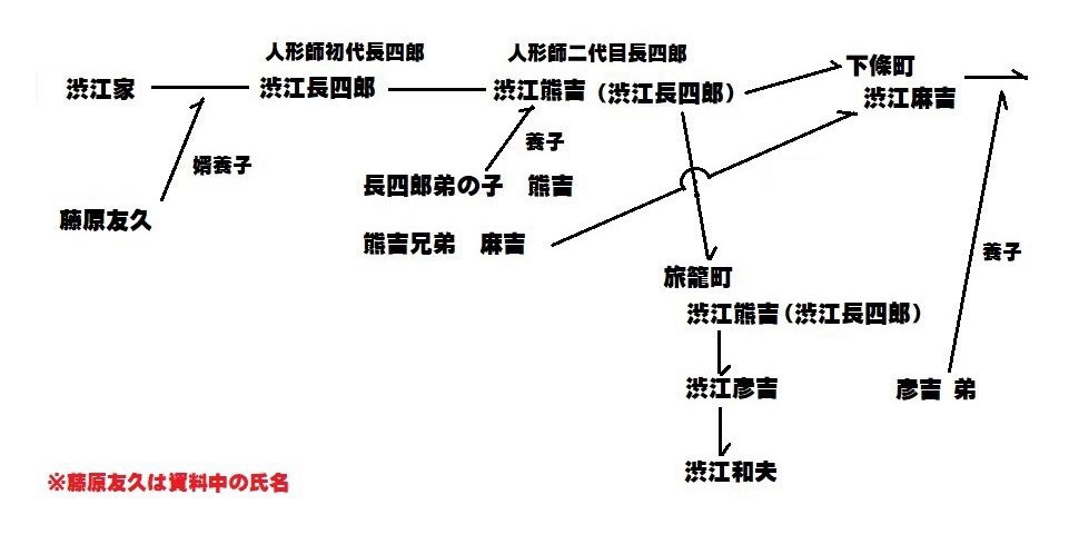渋江和夫さんのお話では初代渋江長四郎、二代目彦吉で廃絶したとのことです。長四郎の子は商いをおこなっており人形制作には関わっておらず、したがって長四郎と彦吉をつなぐ人物はいないということです。おそらく前出の「房吉」は「彦吉」の間違いだと思われます。また彦吉の制作は昭和30年代初めで終わっているということです (2003年11月22日 聞き取りより)