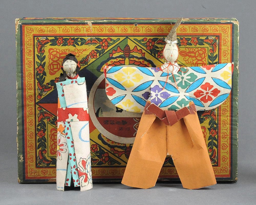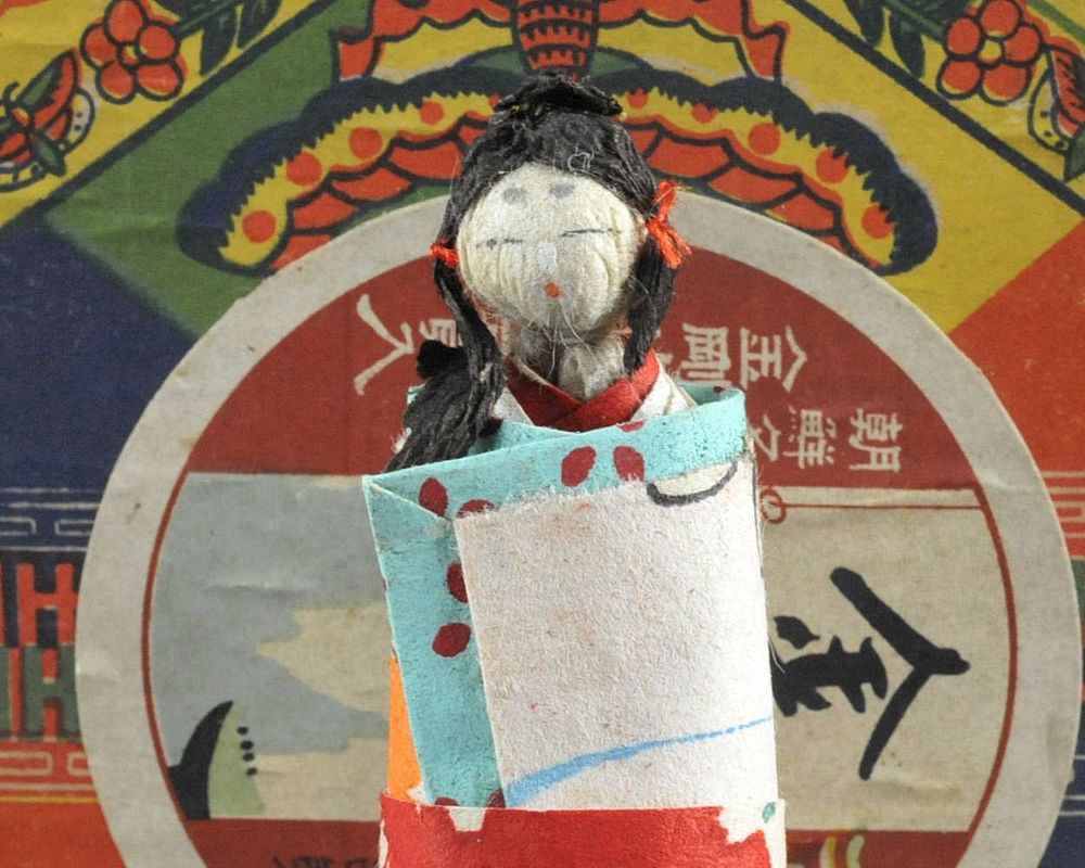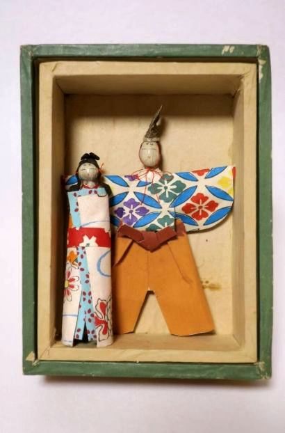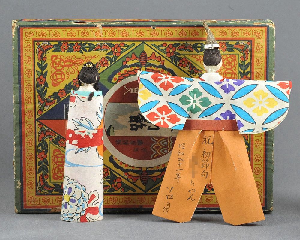 最近になって河村ソロ作の紙雛を入手した。まだ結婚前の昭和21年(1946)に知り合いの子どもの初節句に贈ったもので22歳の時の作品だった。まだ終戦から半年ばかりの物資の乏しい時代に千代紙などを使用して手作りで紙雛を作り、朝鮮土産?の菓子箱に入れて贈っていた。