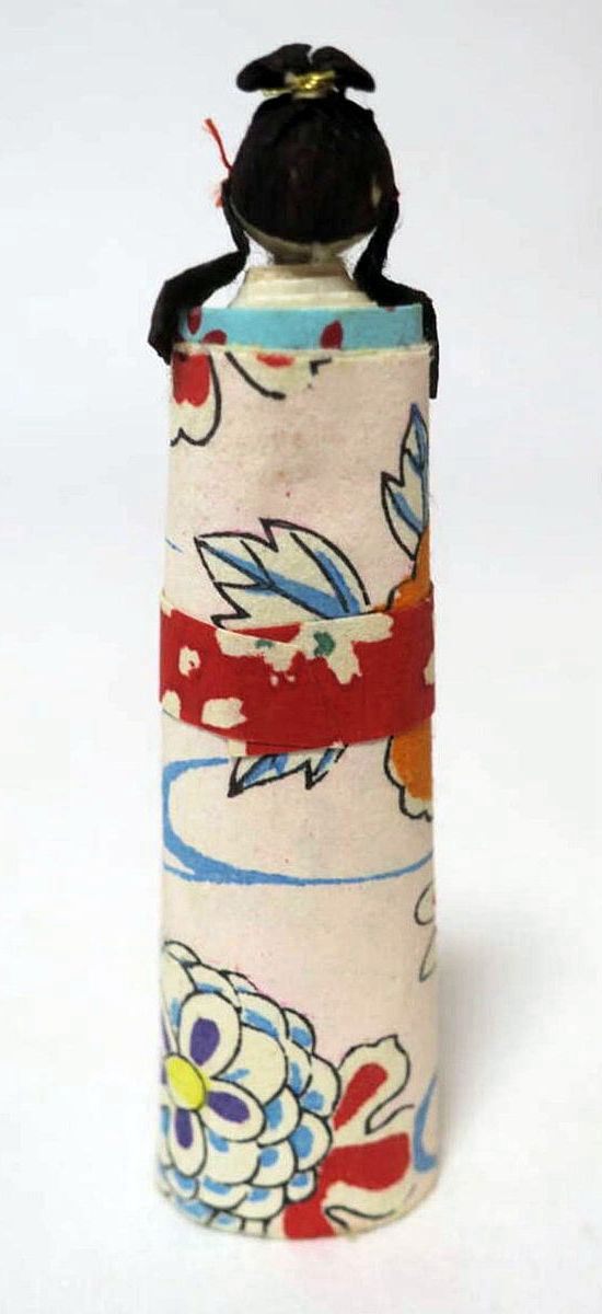 | 髪を作っていた材料の劣化が激しく撮影しようとしたら破損しその断片は粉末状になってしまった 初めて受け取ったときは問題なかったはずだし、小灯にも持参している おそらく薄葉紙にくるんだ際のわずかの力で破損したと思われる これだけ激しい劣化は酸性紙でも見たことがない どのように保管したらよいか思案している なお破損前の画像を拡大復元したのが下の画像である 着物や帯は千代紙でできている |