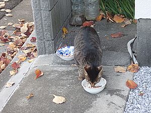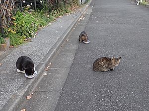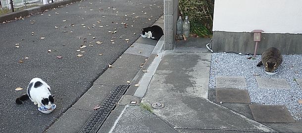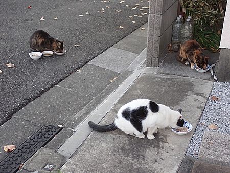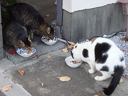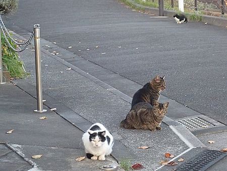 本日の玄関前グループは3匹。元祖黒トラは室内で食べる。