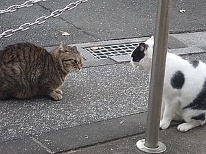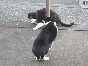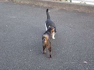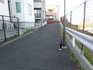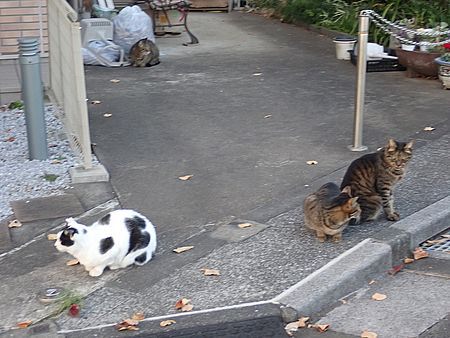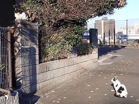 落ち葉を掃除するため少し早目に出かけて行く。団地に黒トラ1号とファントム君がいた。カウ君の視線の先には元祖黒トラとマルハチ君がくっついていた。