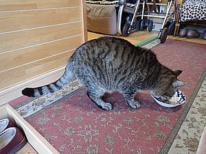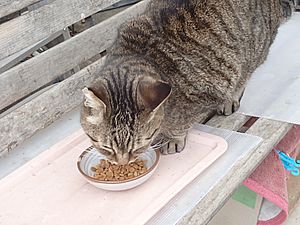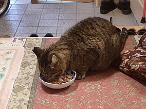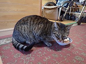 元祖黒トラはまた置き餌を食べている。そろそろ好評カリカリが底をつきそうなので別のカリカリを試してみた。