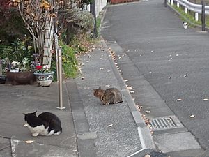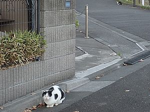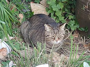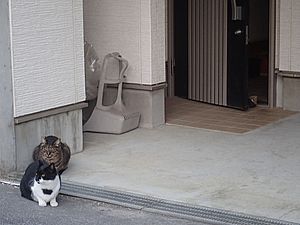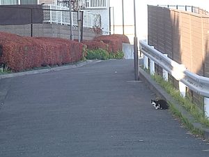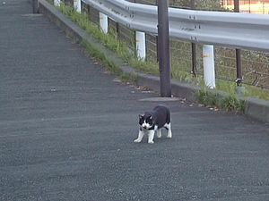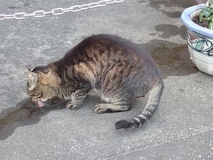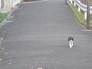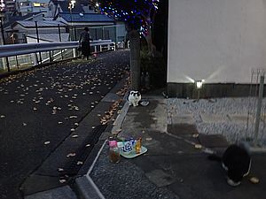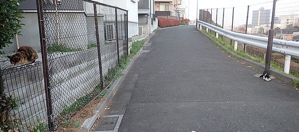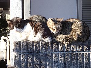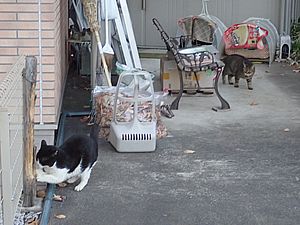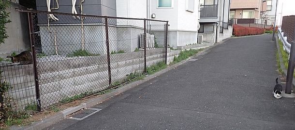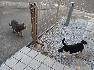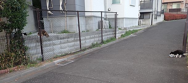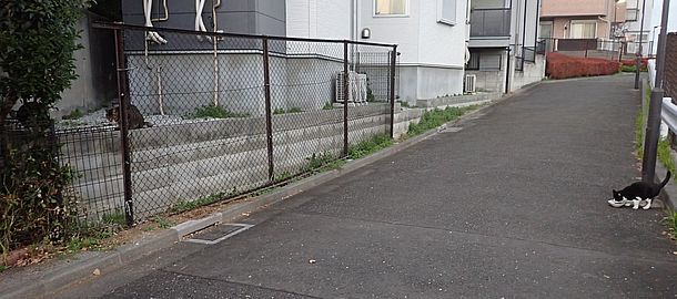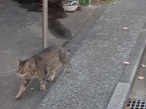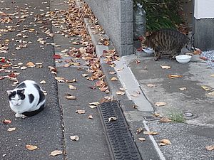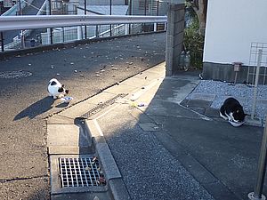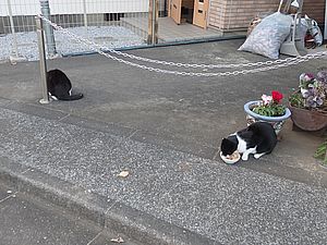 支援物資をもってばあちゃんと猫の様子を見に行く。お友達のうちの前に黒トラ1号とファントム君がいた。