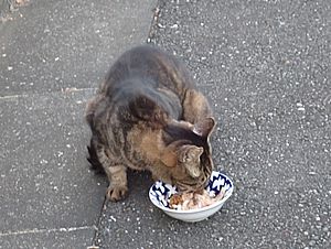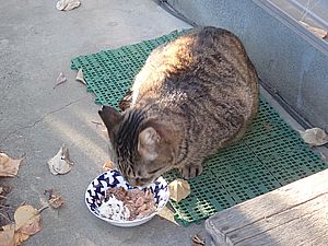 元祖黒トラとマルハチ君に好評カリカリ投入。黒トラ1号はみんなと同じエサを食べないのでスープと好評カリカリを出す。