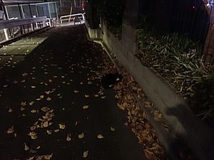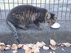 マルハチ君が落ち葉猫になっていた。お友達のうちにいた黒トラ1号は来なかった。ガチャミケは姿を見なかった。