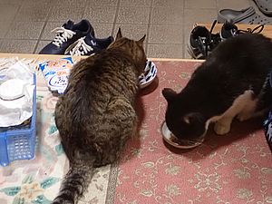 あご黒は残務整理+ちゅーる、ファントム君(手前)もちゅーるを舐める。追加で好評カリカリを食べていた元祖黒トラがマルハチ君に押し出された。マルハチ君が食べた後、元祖黒トラは食べていた。
