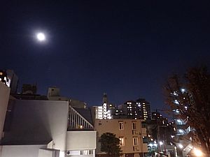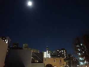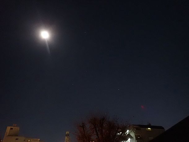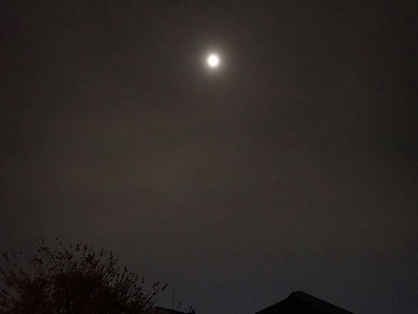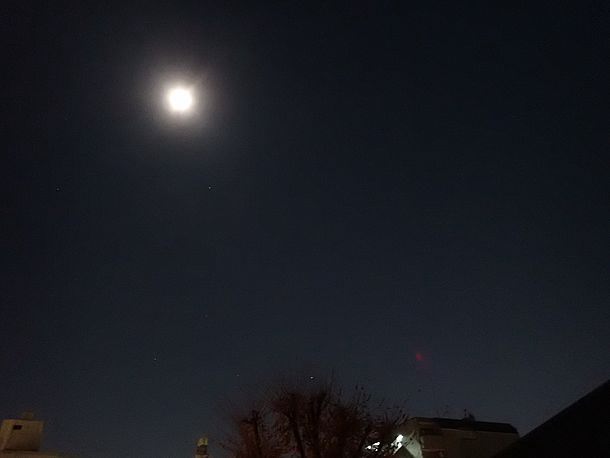 20:06、明日朝に満月になる。空気も澄んでいるのでまぶしく輝く。