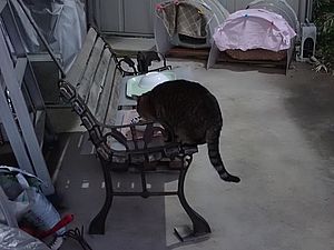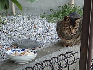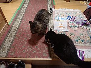 玄関前ではマルハチ君とカウ君が食べる。マルハチ君は少し残したが好評カリカリ投入で完食する。