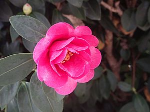 サザンカが開花している。元祖黒トラが小屋の中にいた。他の猫の姿はない。