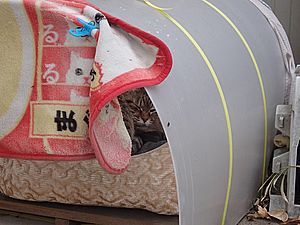 戻ってくると猫の姿がない。小屋に風が入りにくいように補強した。帰る途中に夕食を食べていく。
