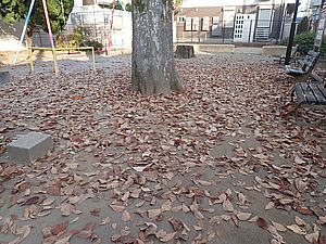 公園のケヤキも先端部分の葉がなくなってきた。根元には落ち葉が積み重なっている。