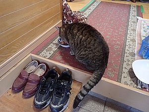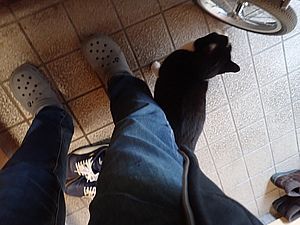 すでにあご黒も待っている。最近はあご黒も早い時刻に対応している。今日も玄関に入ってきてスリスリしてきた。