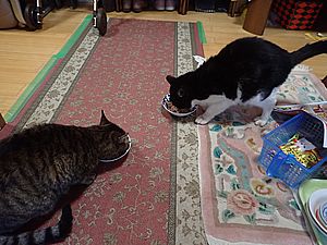 猫三角地帯でファントム君とガチャミケが食べる。あご黒は定位置で食べるが撮影し忘れた。