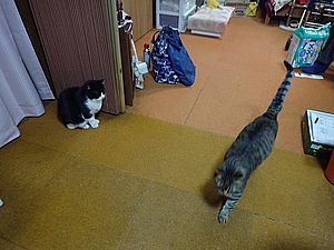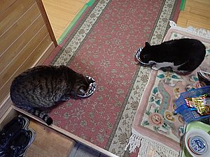 2匹が室内でくつろいでいる。元祖黒トラはまた置き餌を食べている。