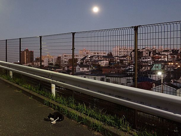 「猫と月」。今日の漁夫の利、カウ君が舐めない2皿目のちゅーるをあご黒は舐めていった。