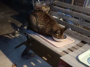 食事タイムの準備をする。元祖黒トラは室内で先に食べる。