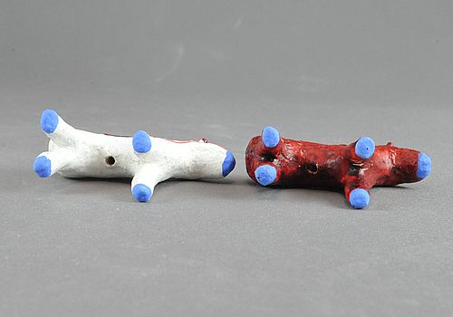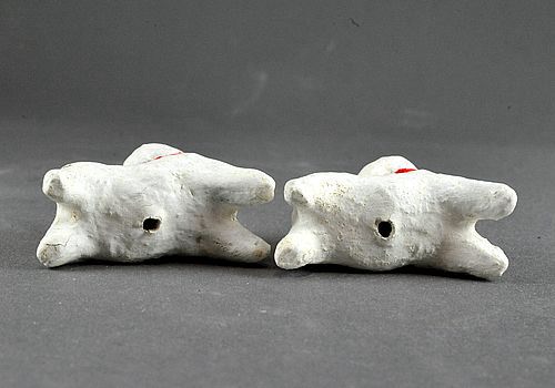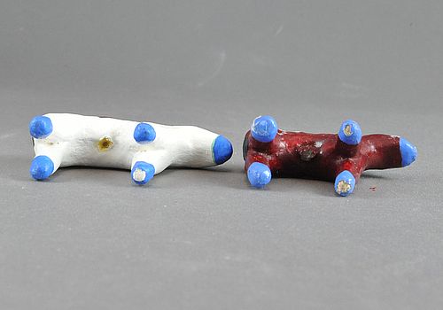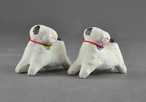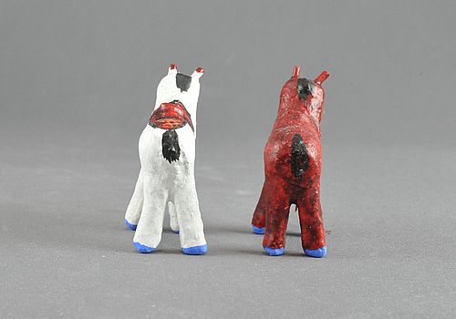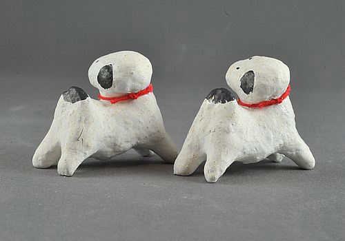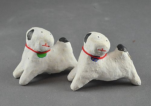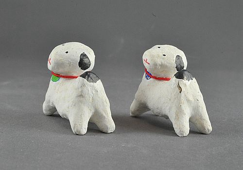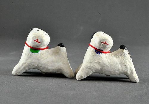 2匹で一組になっている 首輪は赤い糸が結んであり、それぞれに緑と青の飾りがつく 由来書によれば2つを求め、1つを氏神様に供え、 もう一つを自宅の神棚において安産と 子どもの健やかな成長を願ったという 現在の作品は走って後ろを 振り向いたような構図になっているが、 古い作品はもっと頭が立っており足も直立している 無印良品の2018年福缶にも採用されたようである 高さ40mm×横52mm×奥行24mm |