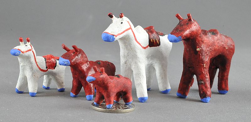 それに対し練り物人形、特に赤馬と犬が有名となった。他にも蛙、鳩、鴛鴦(おしどり)、蝉、獅子頭等の略彩の小品が制作されていたという。すでに昭和初期当時廃絶していたようである。これらの小品は後述の福引種であると思われる。張り子なども制作されたようであるがすでに昭和の初めには詳細がわからなくなっていた。