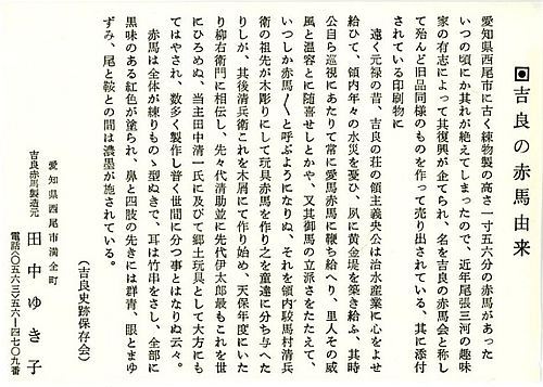 最上段の集合画像とは別個体だが中サイズにあたる 竹くしで角のような耳を再現しているが個体差が大きい。 白馬の耳は短いがこれは元のままのサイズ 左下の箱は最上段の赤白の馬(大)対が入っていたもの 右下の由来書は吉良史跡保存会の監修だが、 川崎巨泉(1932)が出展のようである 他の書籍の解説もこの文献から引用されたものが多いようだ |
