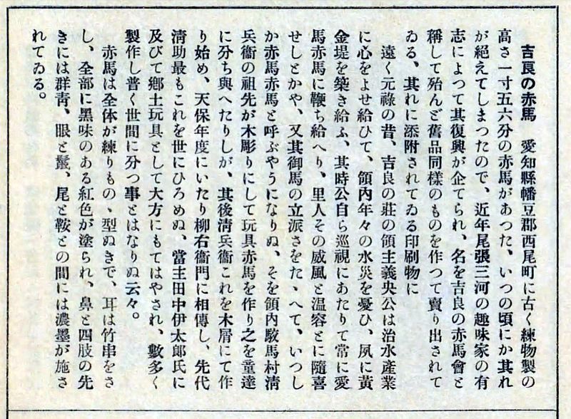 吉良の赤馬由来によれば江戸時代のころ領内の清兵衛が木彫で玩具赤馬を作って子どもたちに与えたが、後に木くずをで作り始め、天保年間に柳右衛門に伝授し、田中清助、田中伊太郎の時代に世に広まり、田中清一の代で郷土玩具としてもてはやされたという。 川崎巨泉(1932)