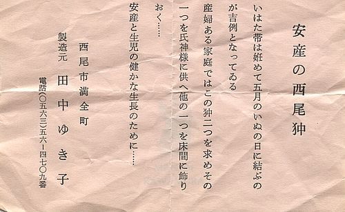 一度だけ田中ゆき子さんのお宅を訪問し、作品を購入したことがある。記録が残っていないので何を購入したかは判然としないが「西尾の狆」と箱入りの「赤馬」はその際に購入した可能性がある。いっしょに対応していただいたのは早夜子さんではないかと思われるがはっきりはしない。木型も見せていただいた。かなり摩滅していたので古い型であったのだろう。