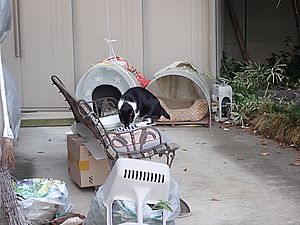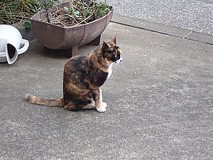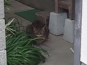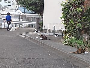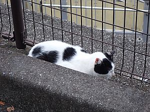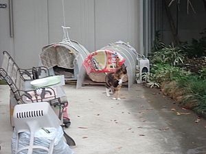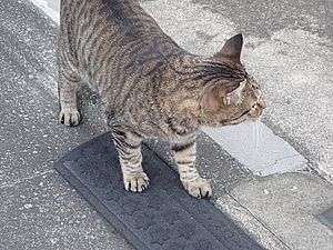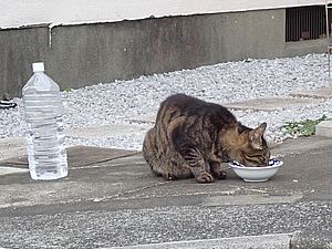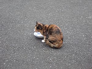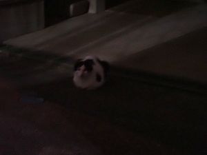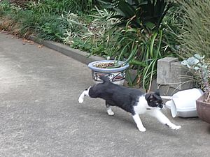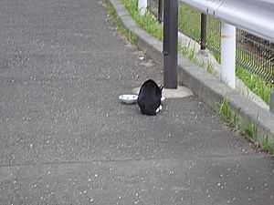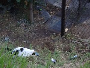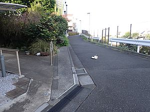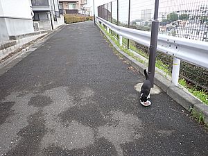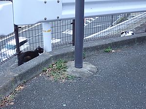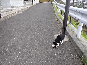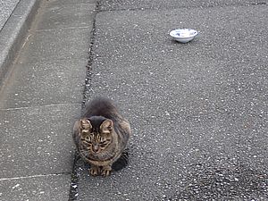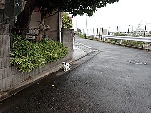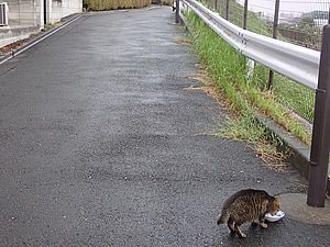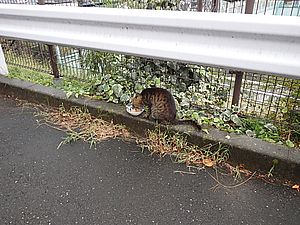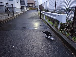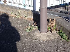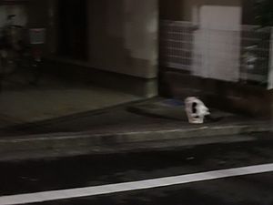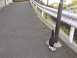 支援物資を持ってばあちゃんと猫の様子を見に行く。道の真ん中にカウ君が転がっていた。