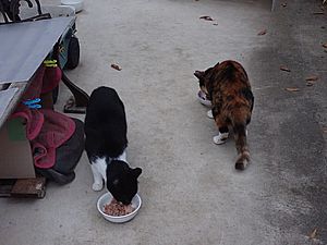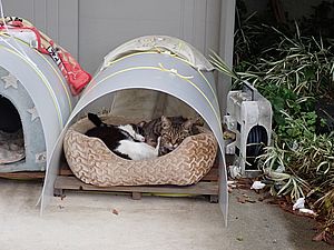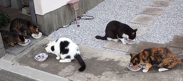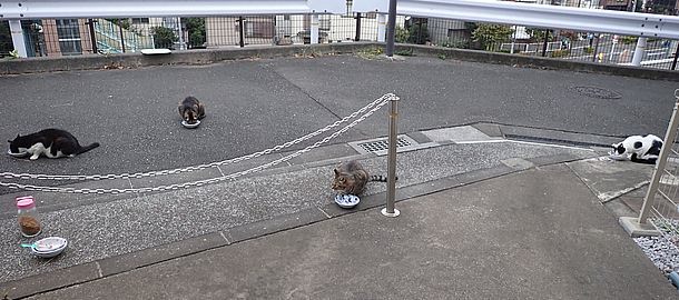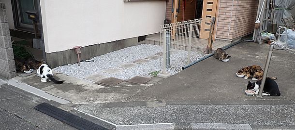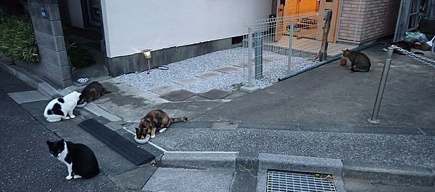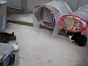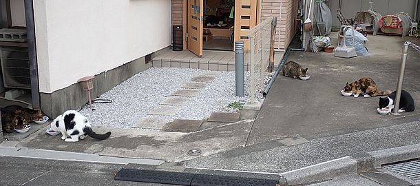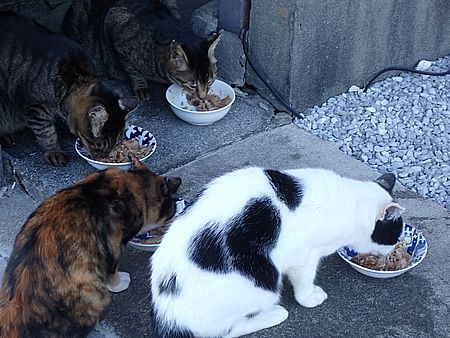 夕方になって支援物資を持ってばあちゃんと猫の様子を見に行く。猫たちが集まってきた。