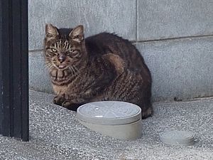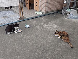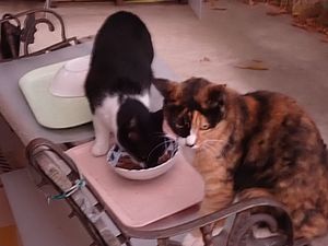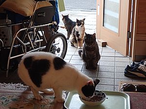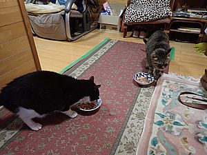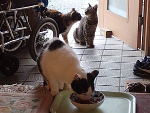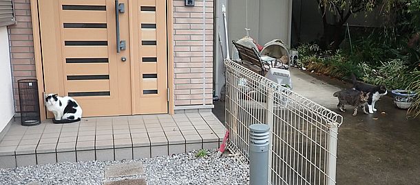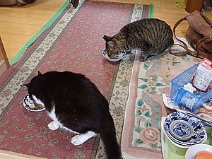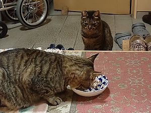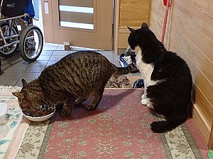 今日もカウ君は高級猫缶を食べない。ファントム君とガチャミケは玄関前で並んで食べる。