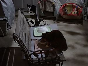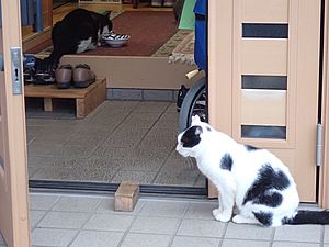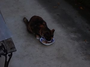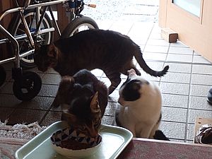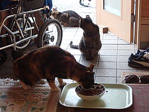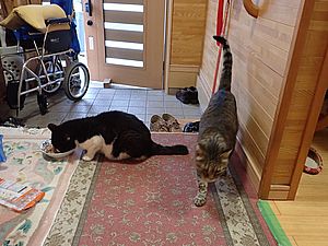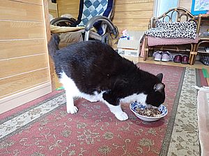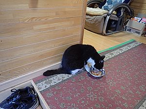 マルハチ君が小屋に入った。元祖黒トラはまたカリカリを食べている。