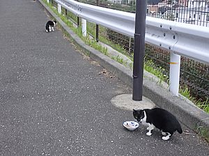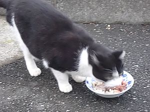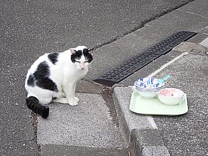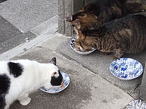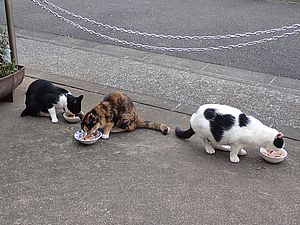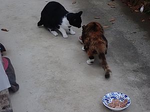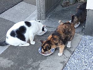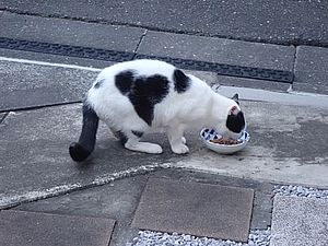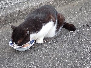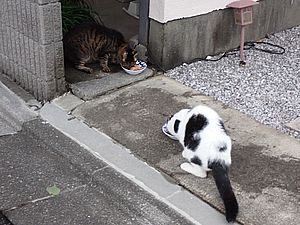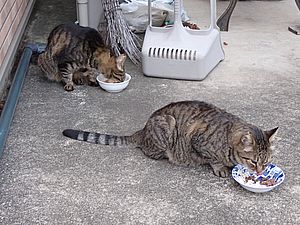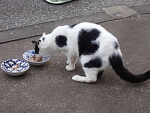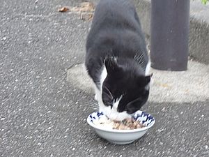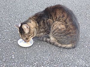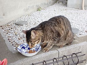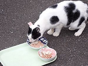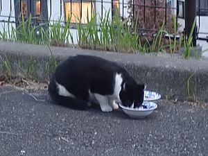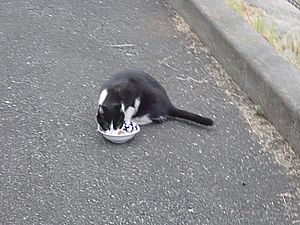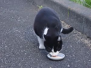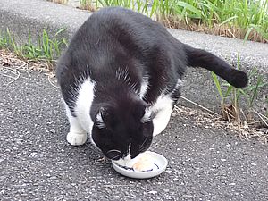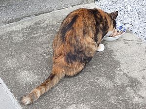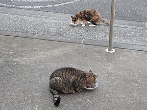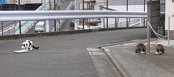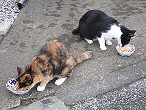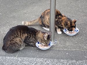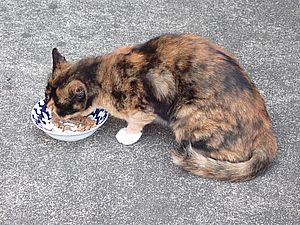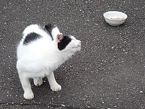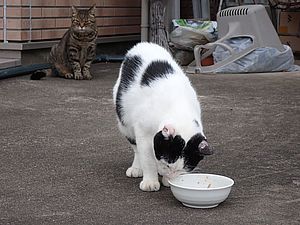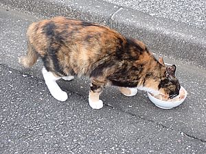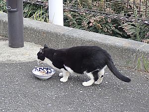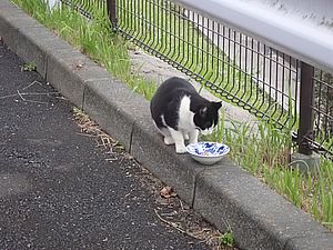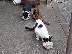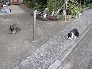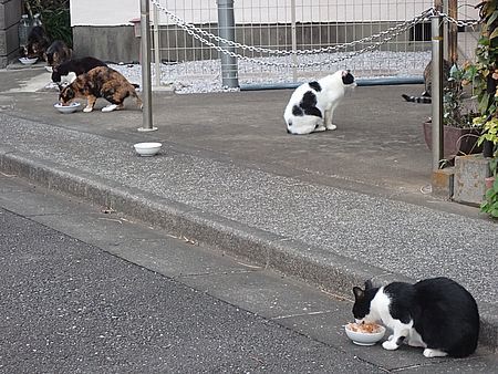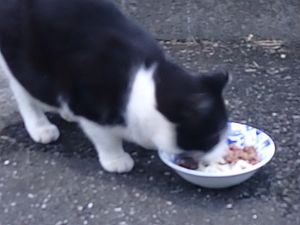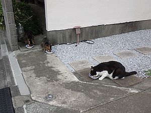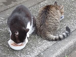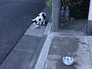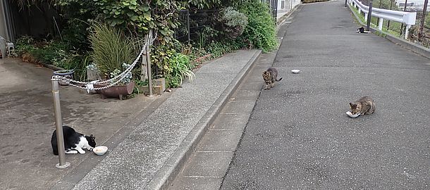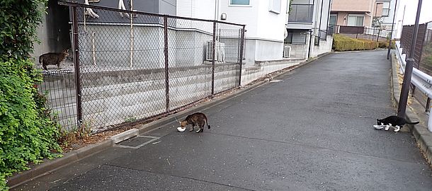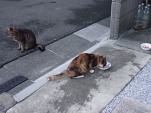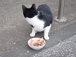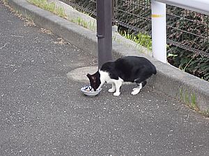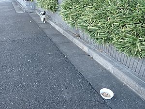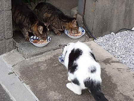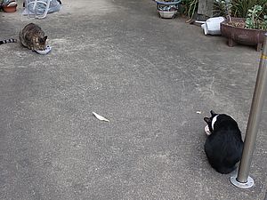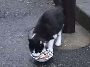 マルハチ君は路上食い。カウ君はさらに追加も食べている。まったく猫の嗜好はわからない。