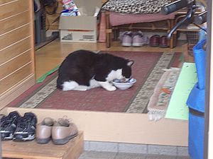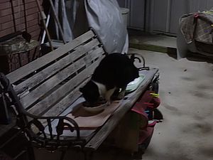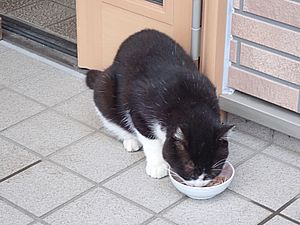 ファントム君は玄関前で食べる。