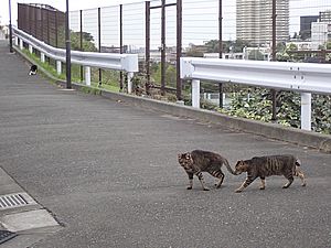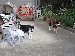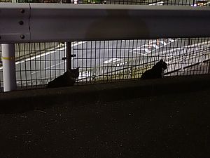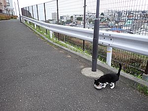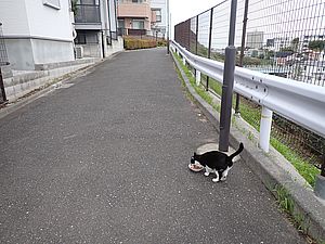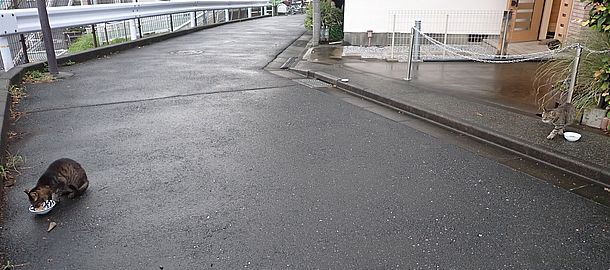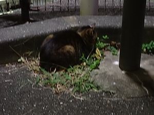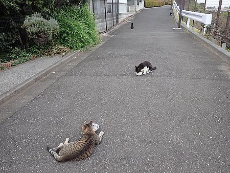 夕方になって支援物資を持ってばあちゃんと猫の様子を見に行く。元祖黒トラとマルハチ君が道路の中央にいた。