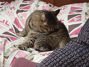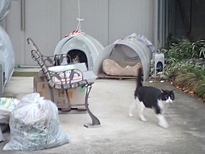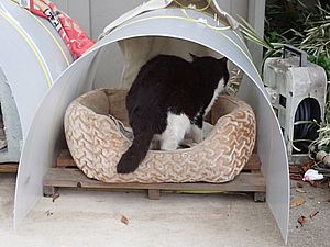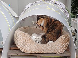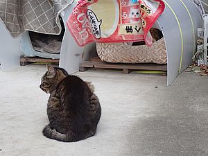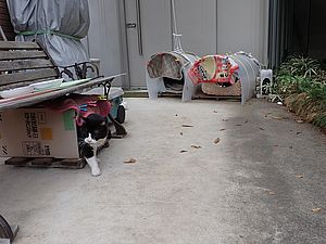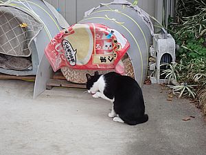 瀬戸の編集の続きをおこなう。何とか明日にはアップしたい。夕方になって再び支援物資を持ってばあちゃんと猫の様子を見に行く。ファントム君がカゴ猫になっていた。