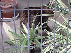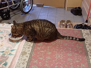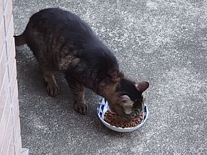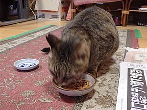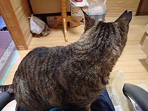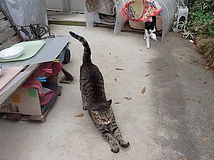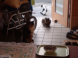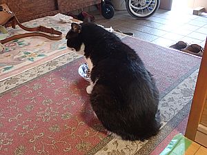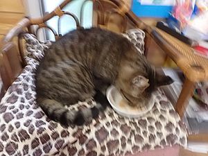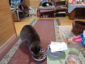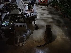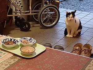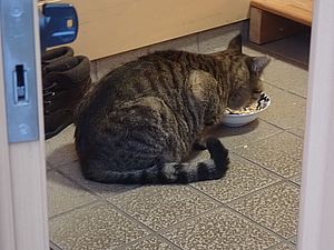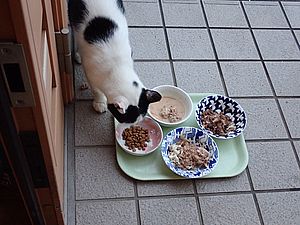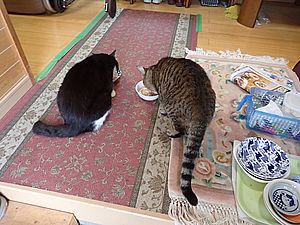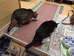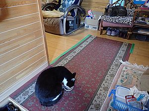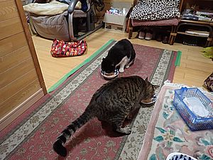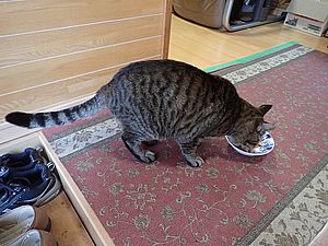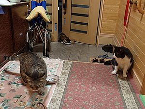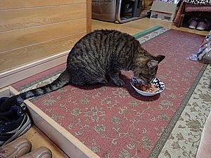 室内ではまたマルハチ君が置き餌用のカリカリを食べている。元祖黒トラは待機中。選手交代。
