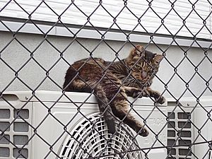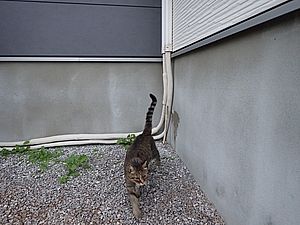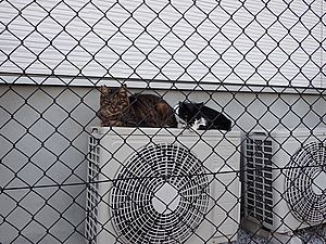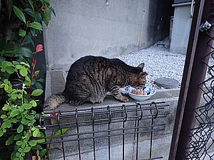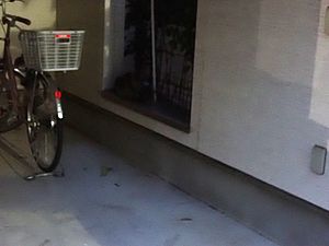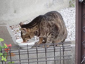 あご黒がやって来た。黒トラ1号がアパートの室外機の上にいた。あご黒は定位置で個食。