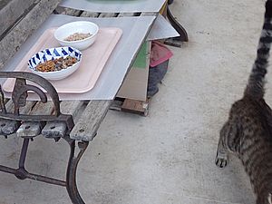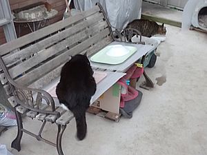 マルハチ君と元祖黒トラは再びくつろぐ。ガチャミケは完食してしまった。再び置き餌を作ってベンチに置く。