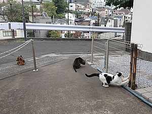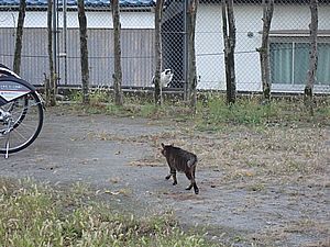 遠くにはあご黒と黒トラ2号外ル。元祖黒トラとマルハチ君も小屋から出てきた。