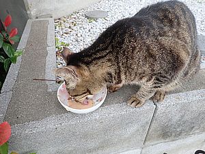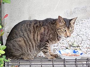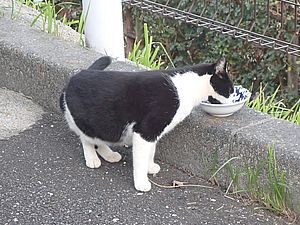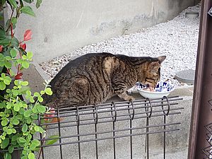 葉に付いた水を舐めていた黒トラ1号は縁石の上で高級猫缶を食べ始めた。黒トラ2号があご黒の残務整理。