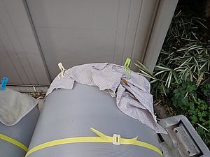 昨日補修した小屋の裏側はうまく機能しているようだ。単純な作りの方がよさそうだ。もう少し涼しくなってきたら保温のために全面の覆いも取り付けよう。今日四健の草刈りが入ったようで隠れる場所がなくなっていた。