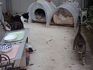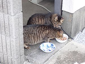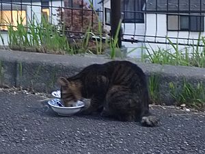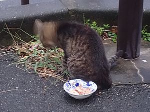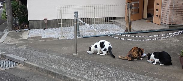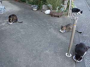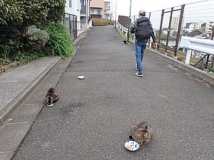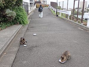 器を持って追いかけ回して猫たちに食べさせる。
