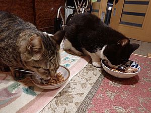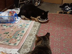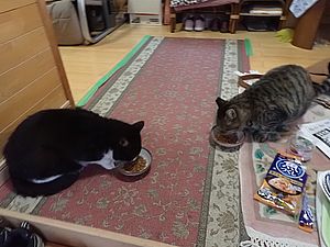 自分の分が残っているのにガチャミケはファントム君のエサを食べている。他猫の餌はうまい。