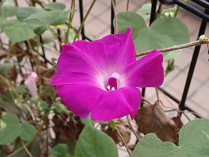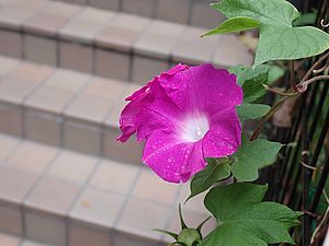今朝も天気が悪い。公園では仕事準備中。アサガオが咲いていた。最後のアサガオか?小さなイチゴもできている。