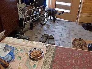 カウ君に4種類のエサを置いたがカリカリを少し食べただけ。しかし玄関内に要求には来る。