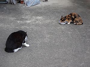 ファントム君は少し離れて今日も特別食。元祖黒トラは道の真ん中で食べる。
