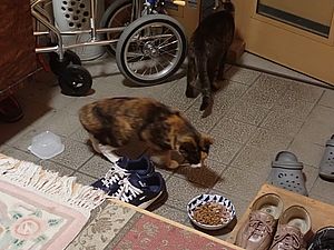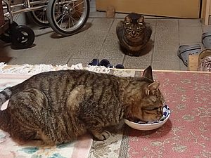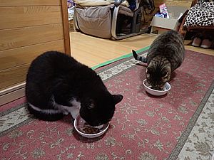 元祖黒トラはマルハチ君に慕われてくっつかれている。元祖黒トラがまた置き餌のカリカリを食べている。