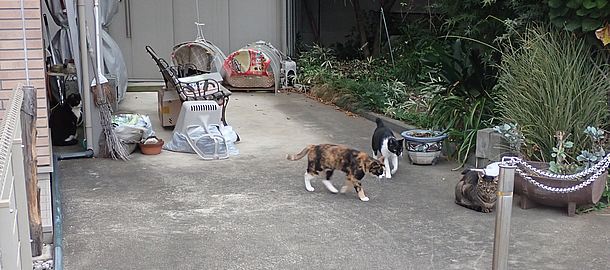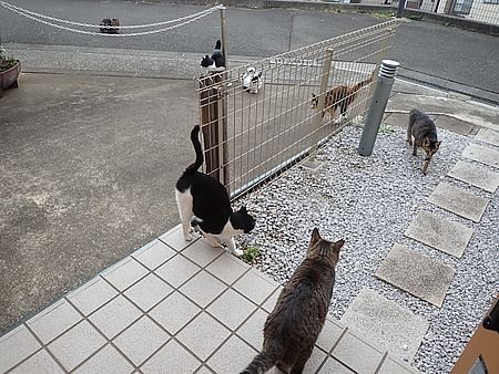 玄関前ではガチャミケが早々と離脱してファントム君のエサを狙っている。